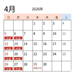 4月の休業日につきまして、下記の通りご案内申し上げます。